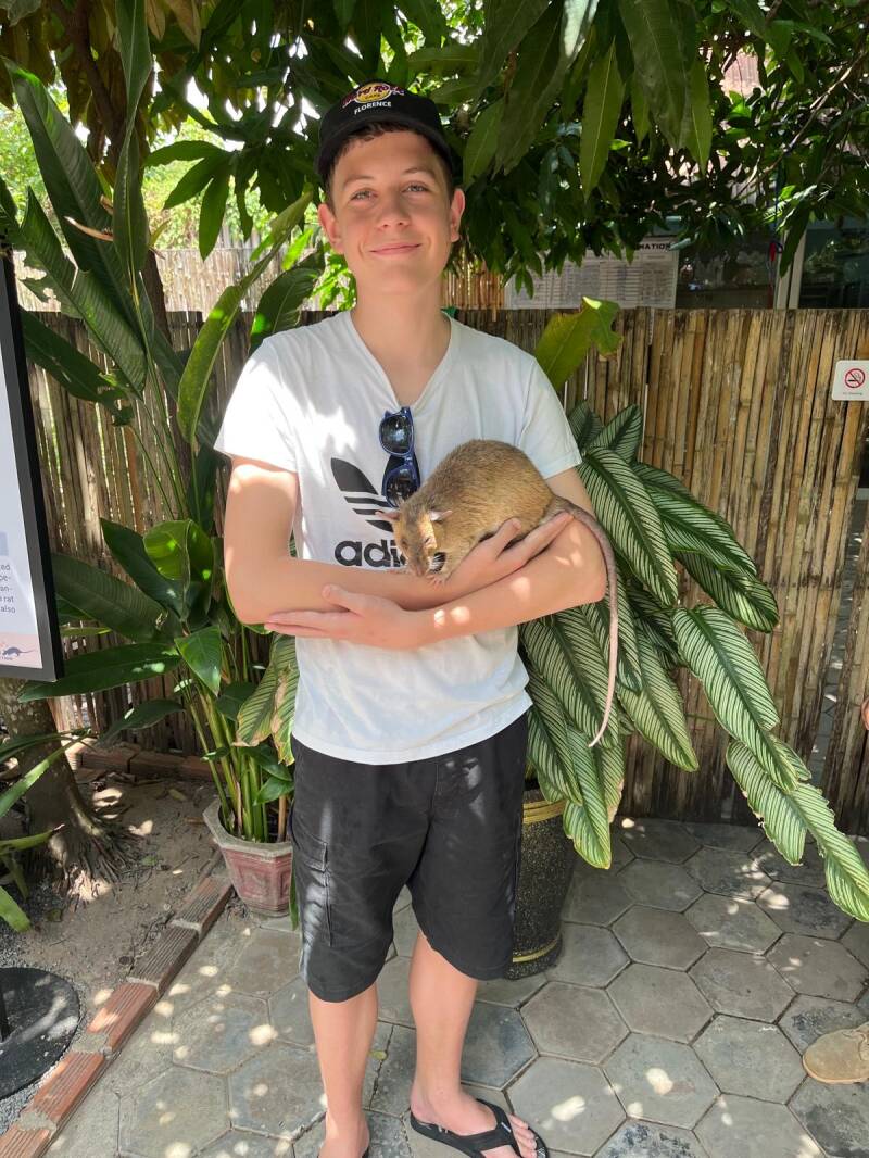 Heute haben wir APOPO eine Organisation, die Ratten ausbildet, welche Landminen suchen. Diese Ratten sind in ganz Kambodscha aktiv und haben bis heute viele Minen gefunden, die von Menschen geborgt werden konnten. Wir durften auch eine Demonstration ihrer Suchkünste bestaunen und sie mal halten, die im Gegensatz zu denen in Europa riesig waren. Danach machten wir einen gemütlichen Nachmittag am Pool. Anbei noch ein paar Bilder der Minen-suchenden Ratten.