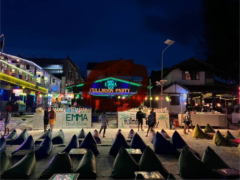 Bei jedem Vollmond findet am Strand von Haad Rin die weltberühmte Full Moon Party statt. In der Hochsaison kommen bis zu 30.000 Leute vorbei, um an diesem Fest teilzunehmen. Als wir jedoch dort waren, waren etwa ein paar tausend (5.000 - 15.000) Leute da. Während dieses Events gibt es Feuershows, laute Musik und eimergrosse Cocktails.