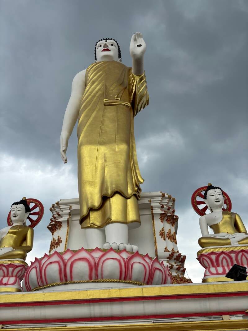 An diesem Heiligen Ort findet man Männer, Frauen und Kinder die hierherkommen um zu beten und Opfergaben zu geben. Diese bestehen meist aus Essen, Trinken und wunderschönen Blumenkränzen. Hier findet man allerlei Götterstatuen, meist vom sogenannten Buddha. Er war ein Prinz aus Nepal, der seinen Adelstitel niederlegte um die Menschen aus dem Kreislauf des Leidens zu erlösen. So wurde er ein Hoffnungsträger und das Gesicht des heutigen Buddhismus. Um ihn zu ehren wurde an der Spitze des Tempels eine riesige Statue von ihm errichtet, zum Vergleich, ich neben der Statue…