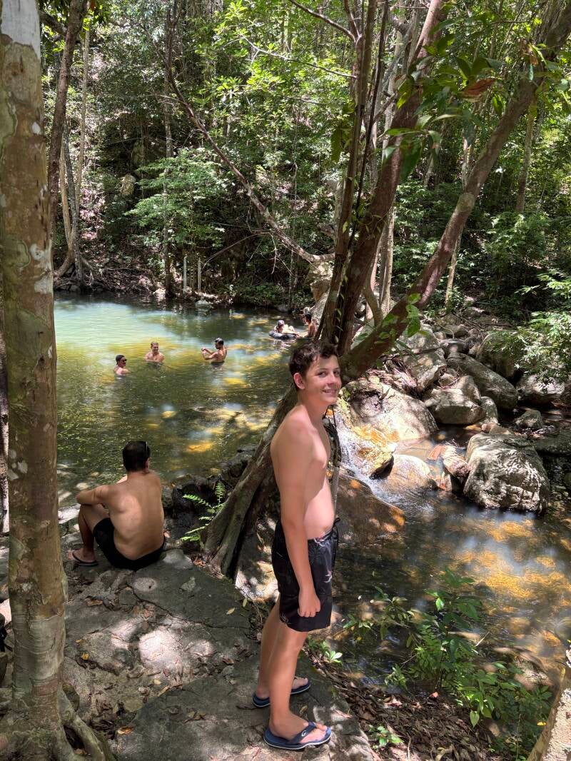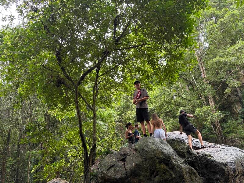 Als Nächstes brachen wir auf in Richtung Mueang. Ein sehr imposanter, sicher 10 Meter hoher Wasserfall, der in einem Dschungel herunterplätschert. Es war ein tolles Erlebnis neben dem Wasserfall zu stehen, gleichzeitig aber auch hypnotisierend.