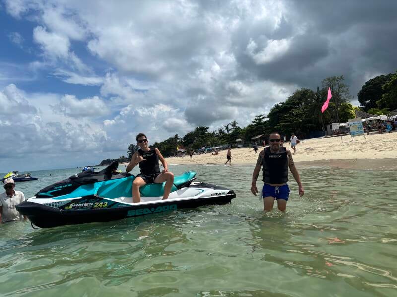 Heute haben wir wieder einmal viel Aufregendes erlebt. Nach einem leckeren Zmorgen, sind wir dann mit unseren Rollern an den Strand gefahren. Dort angekommen haben wir zuerst ein bisschen entspannt und dann gingen Ich und Papi zusammen Jetski fahren. Es war ein tolles Gefühl so schnell über das Wasser zu gleiten. Gleich zu Beginn fielen wir beide einmal kurz vom Jetski, doch den Rest der Fahrt konnten wir einfach geniessen.